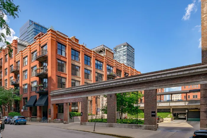 This masterfully renovated 2,000 sq ft corner loft seamlessly blends industrial character with elevated modern design. Situated in a premier West Loop location-steps from acclaimed dining, shopping, and cultural destinations-this north- and west-facing residence is wrapped in original brick, soaring 14-foot coved concrete ceilings, and oversized commercial-grade windows. The designer kitchen is a showpiece, featuring custom light grey cabinetry with gold hardware, an elegant island with veined quartz countertops, a striking chevron marble backsplash all the way up to the ceiling, and top-tier appliances including Wolf, Sub-Zero, Bosch, and a wine fridge. The open layout connects spacious dining and living areas anchored by a double-sided fireplace with custom built-ins. The primary suite features a fully built-out walk-in closet enclosed in black metal-framed glass and a spa-caliber bath with quartz surfaces, subway tile, penny hex floors, and gold fixtures. The second suite offers a soaking tub and refined finishes throughout. Additional highlights include wide-plank walnut-stained hardwood floors, new Lennox HVAC, Google Nest, in-unit laundry, and one heated garage space. Enjoy 24-hour door staff, on-site management, a common sundeck, and an unbeatable, walkable West Loop location.